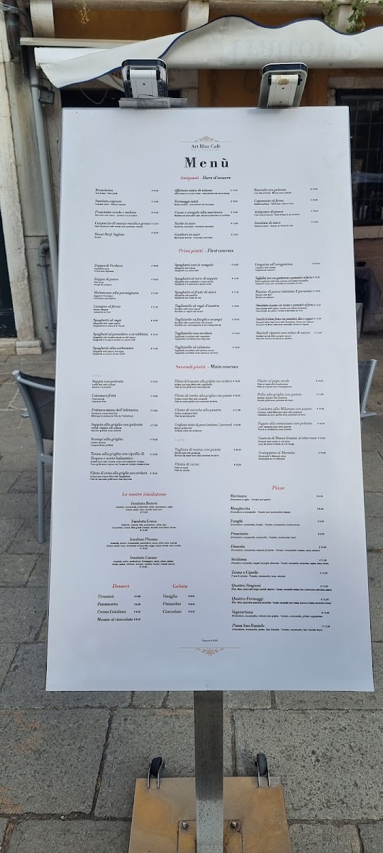Welcome to Art Blue Café, a hidden gem nestled in the heart of Venice at San Marco 2808, Campo Santo Stefano. This charming eatery boasts a menu that brings together traditional Italian flavors with a refined touch. Guests rave about their culinary delights, particularly the remarkable ravioli, hailed by one visitor as the best in the world. The café's signature pasta and pizza also receive high marks, showcasing a perfect al dente texture and fresh ingredients.